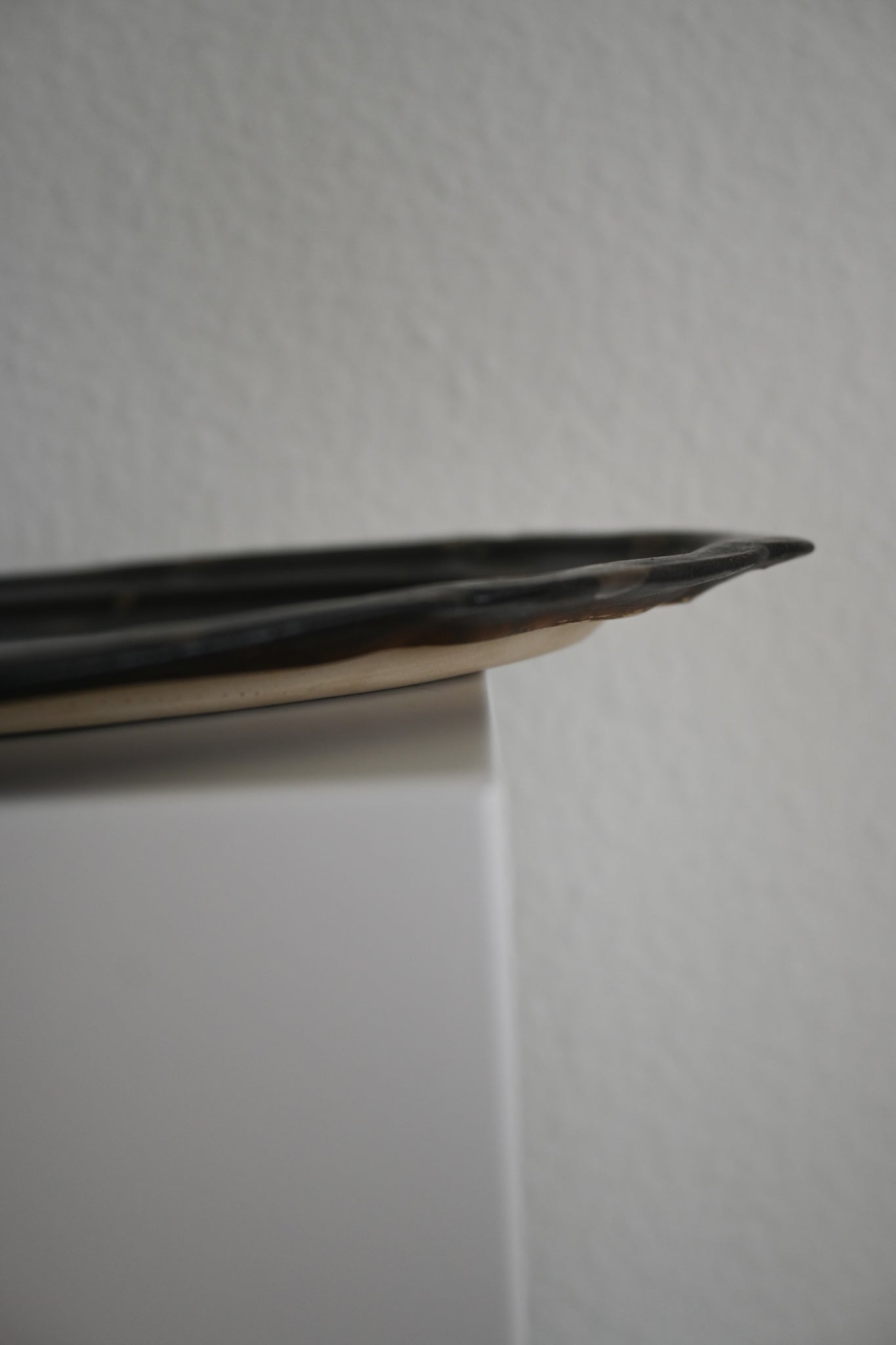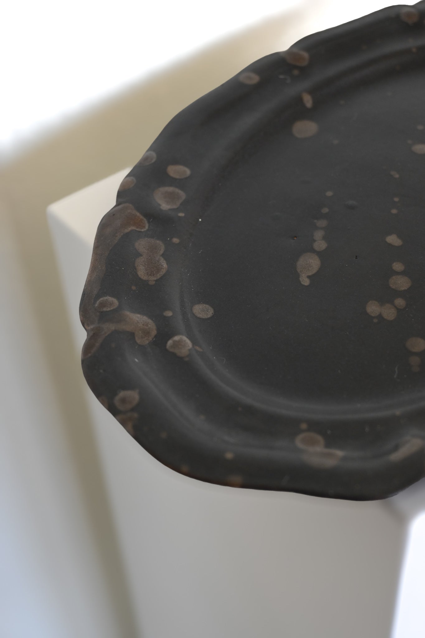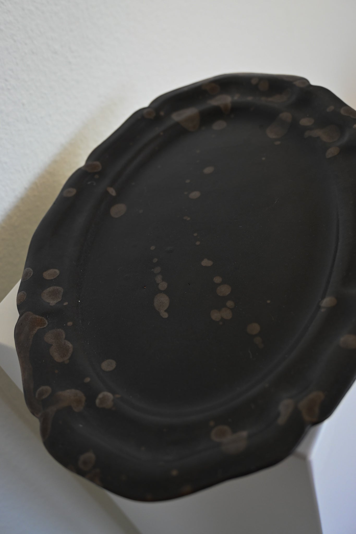 Tunt fint keramikfat. Svart med bronsbruna fläckar