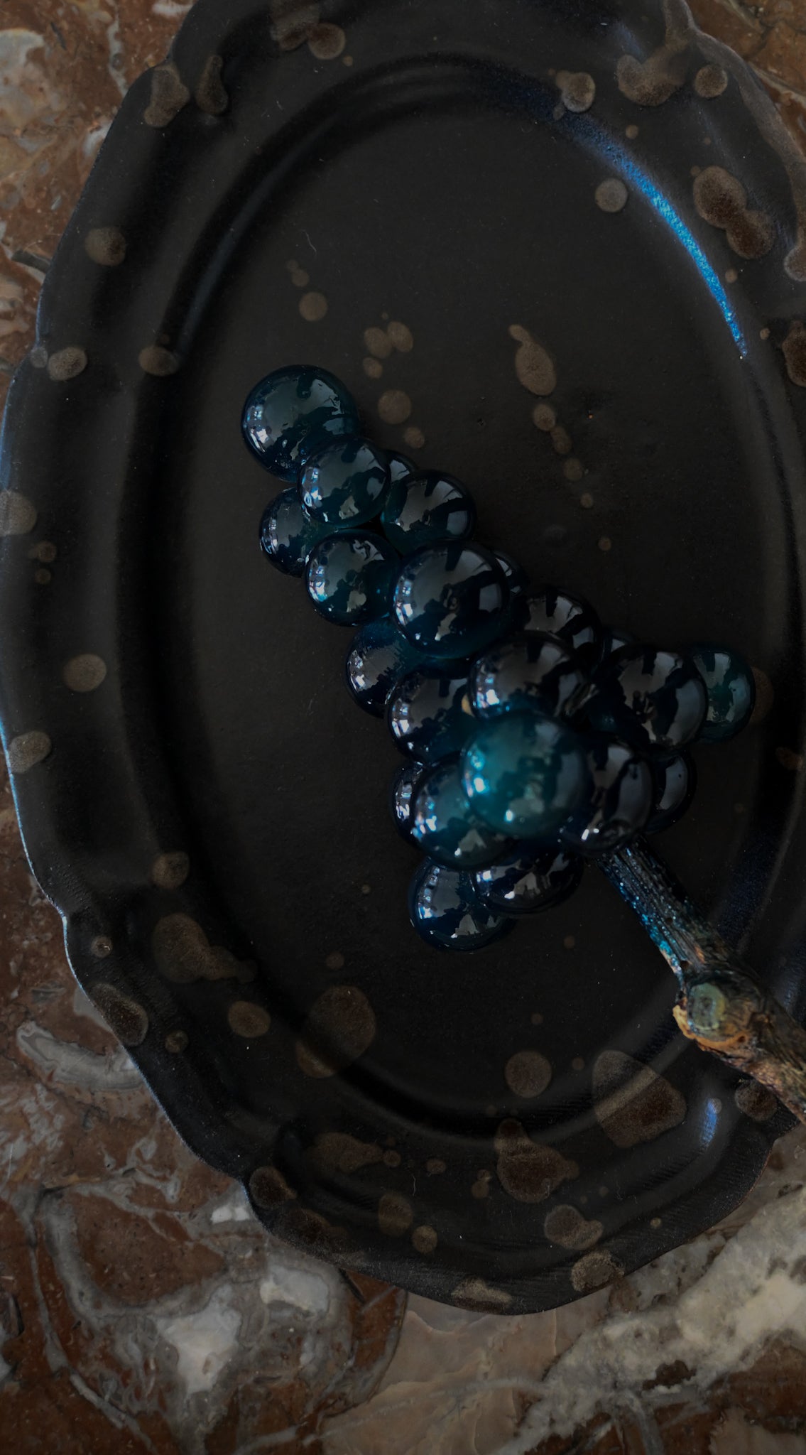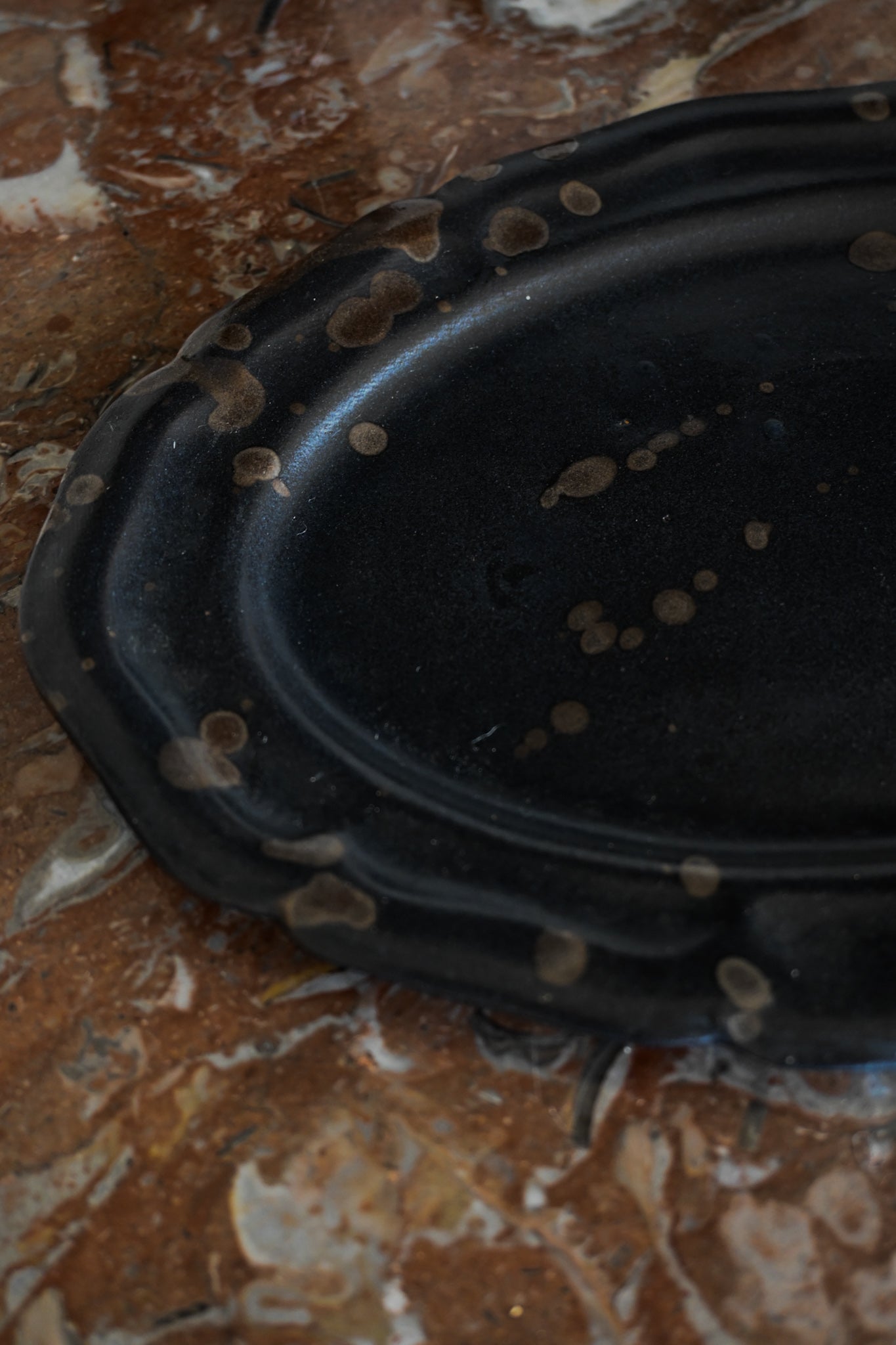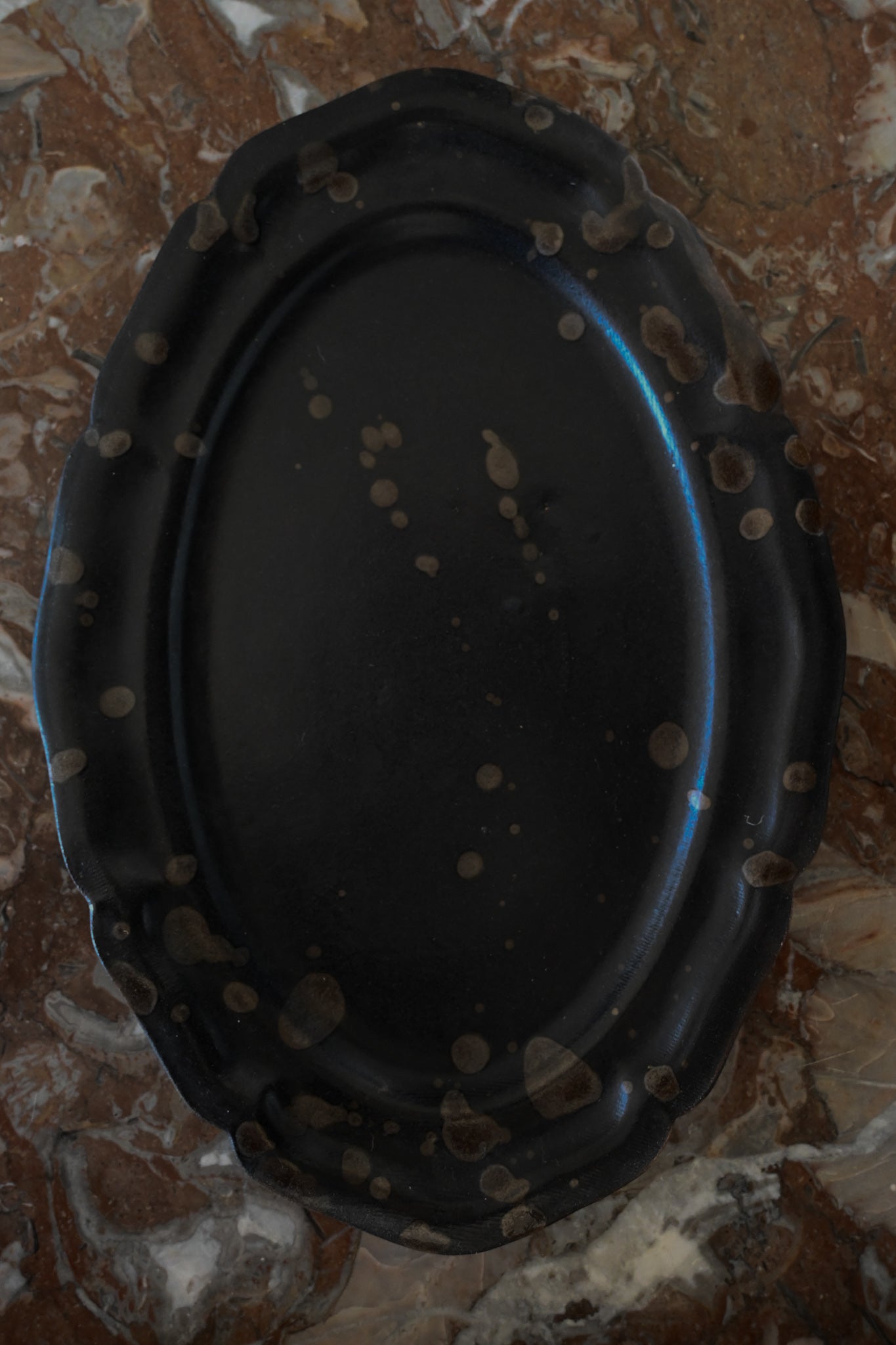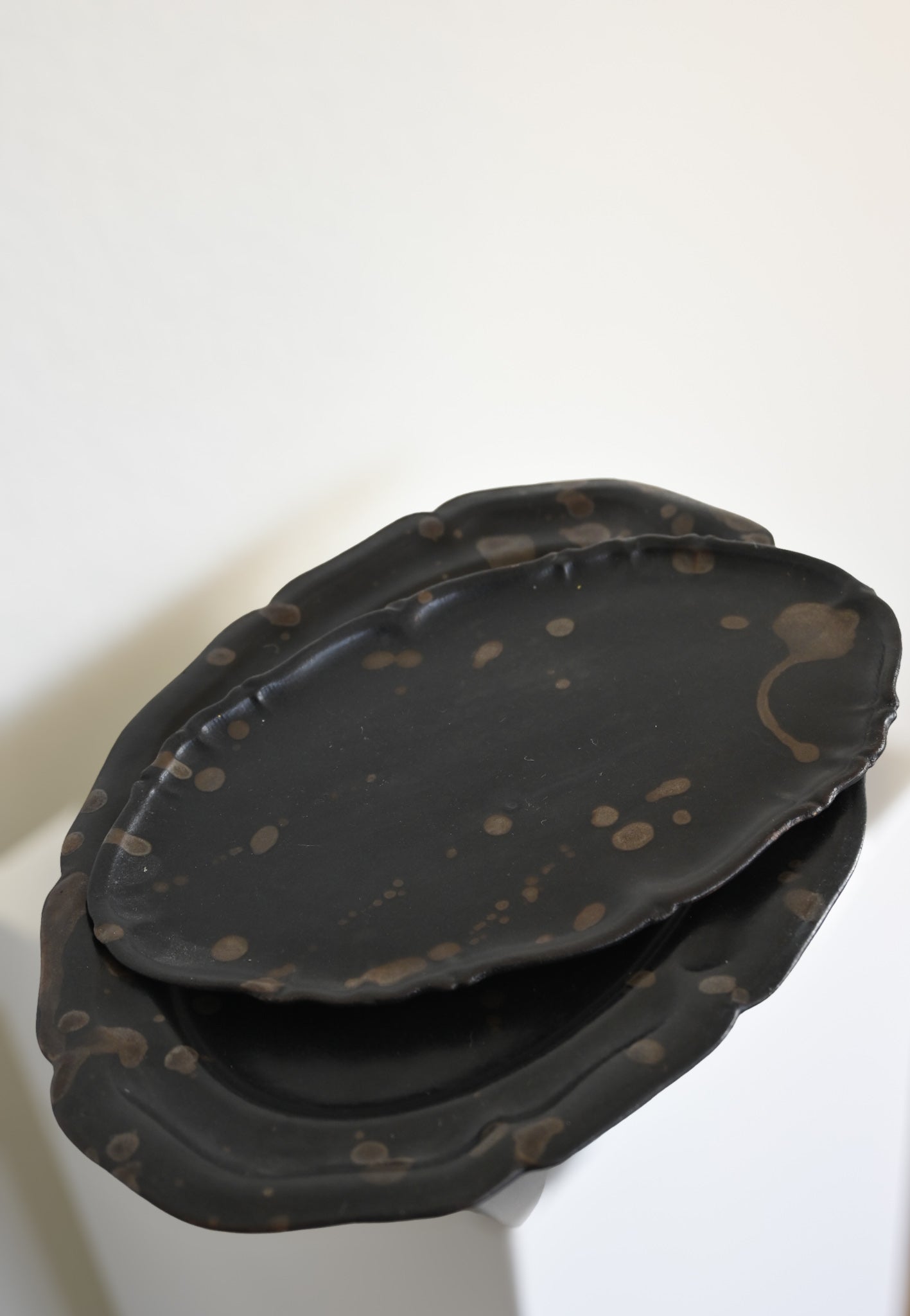 Tunt fint keramikfat. Svart med bronsbruna fläckar