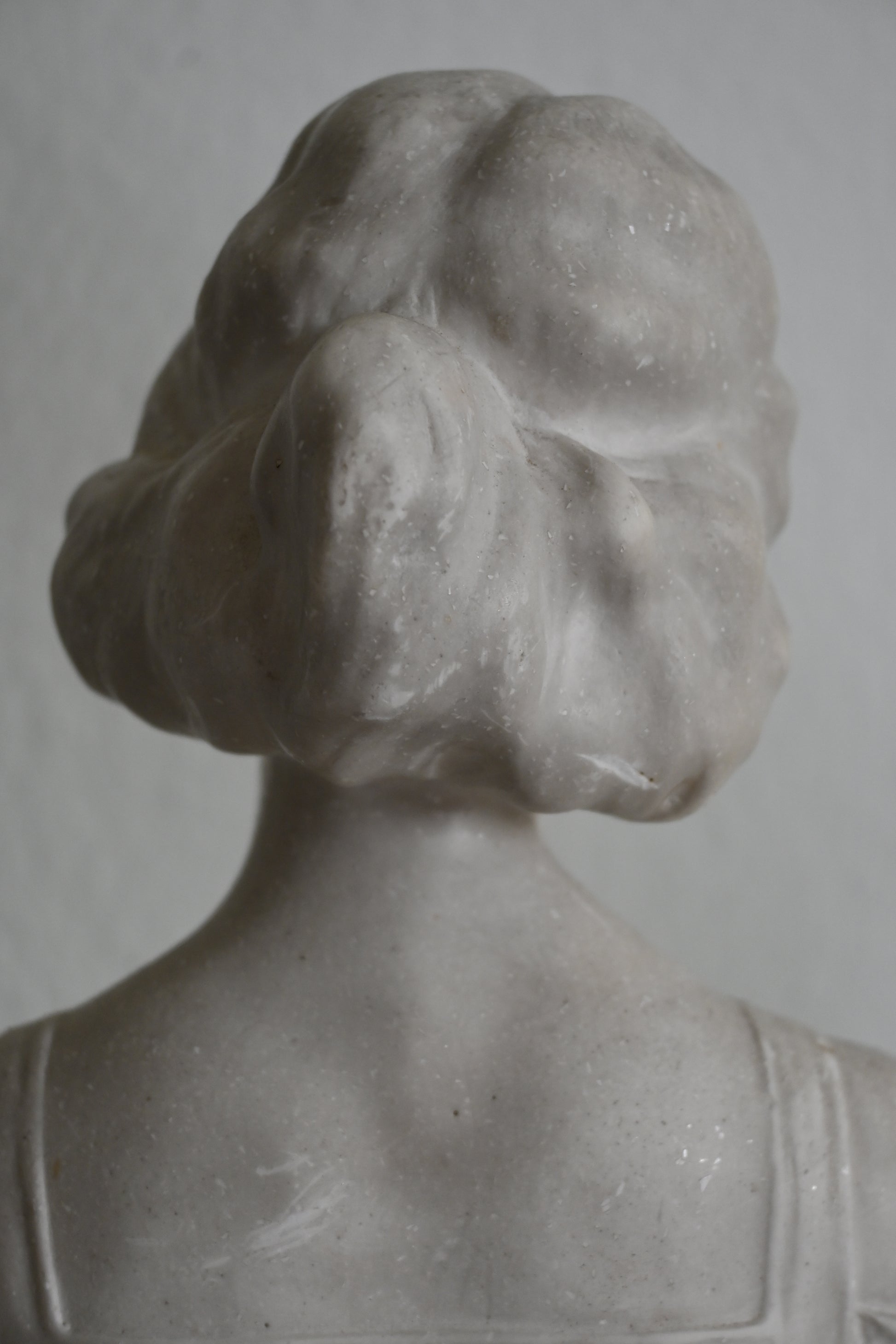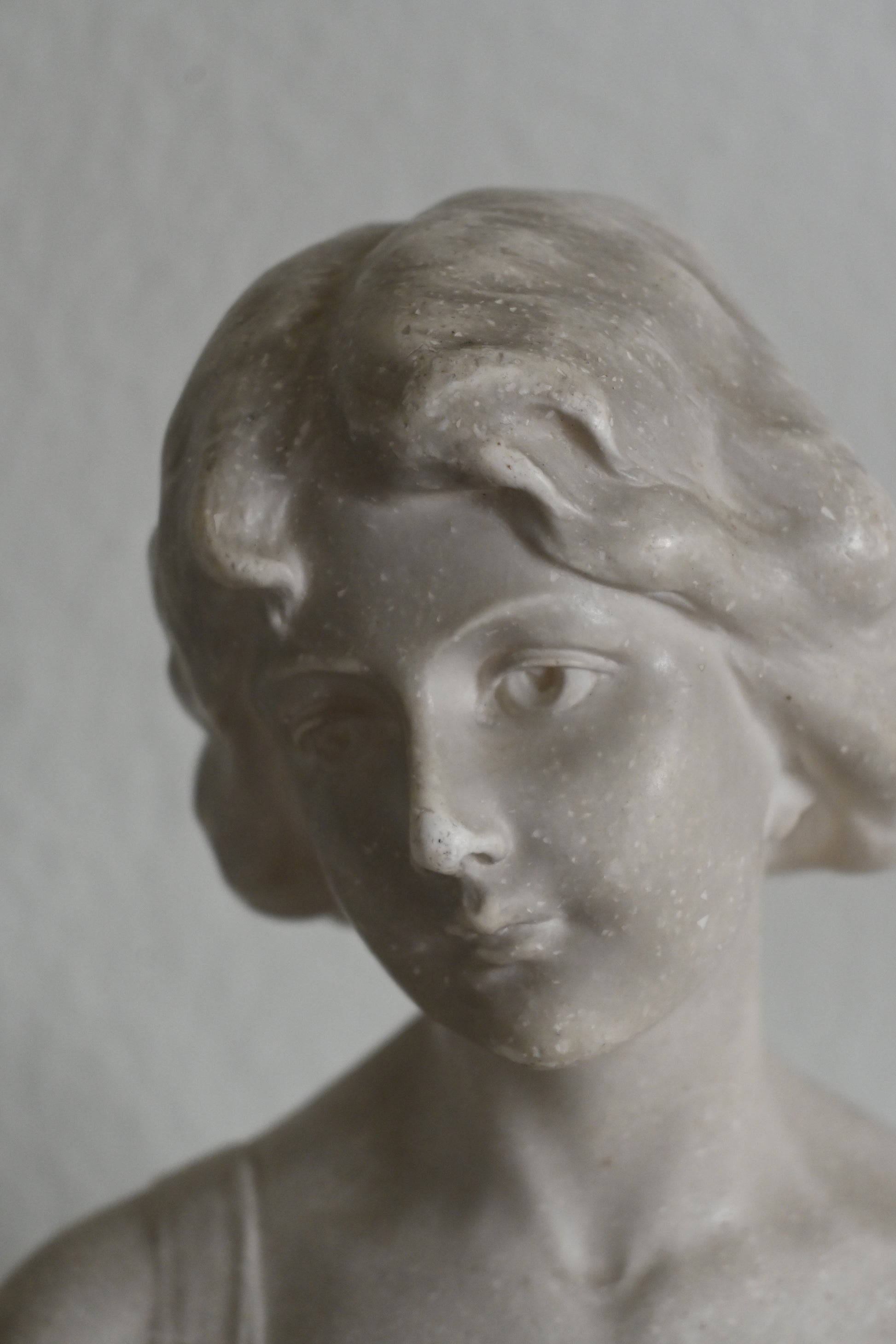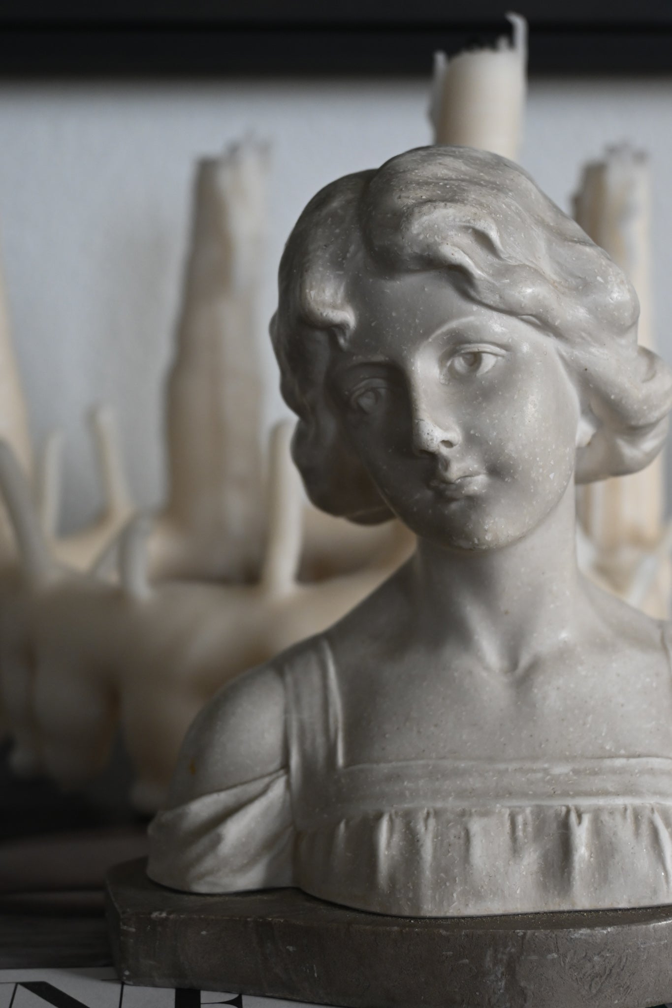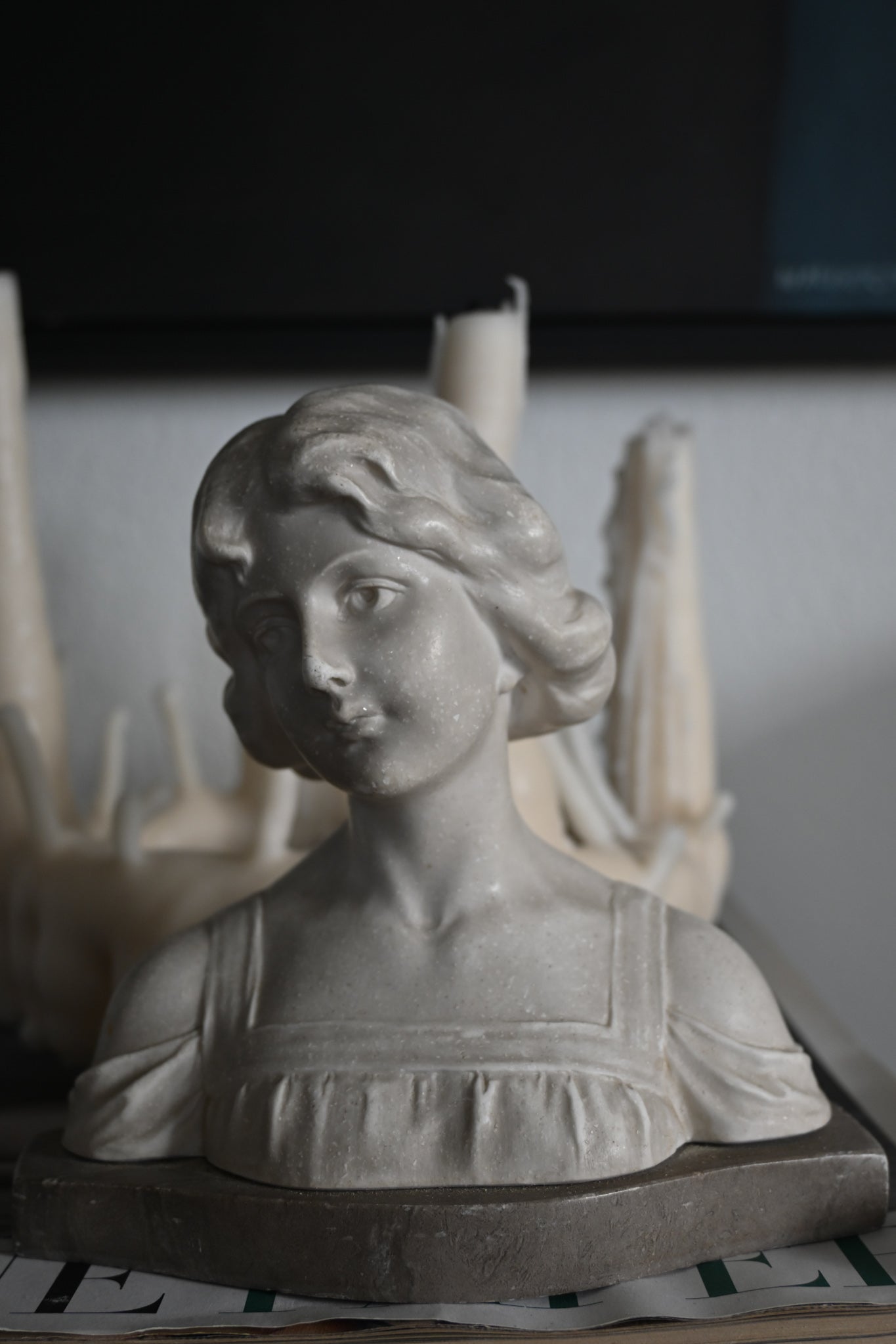 Kvinnobyst i sten på marmorplatta