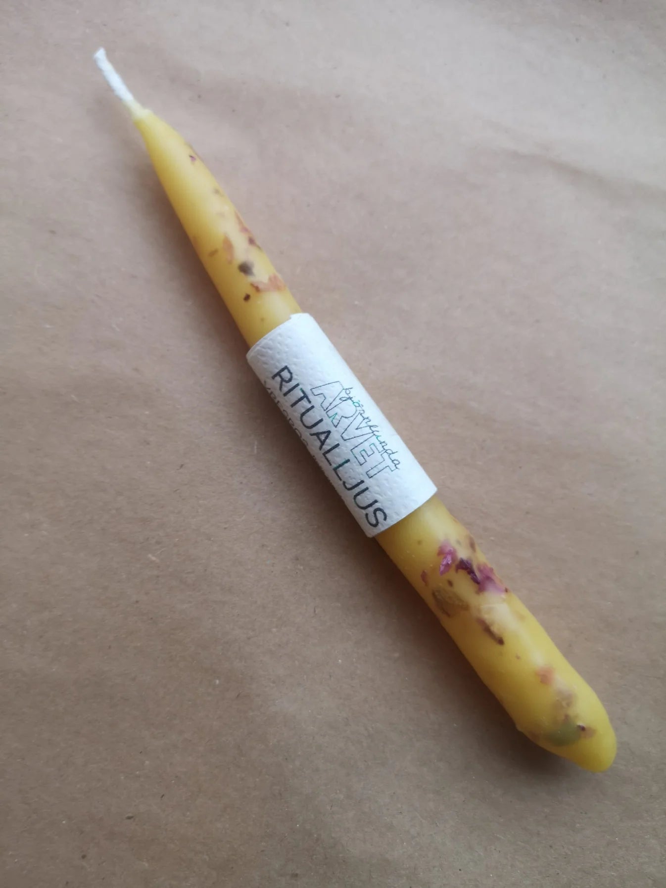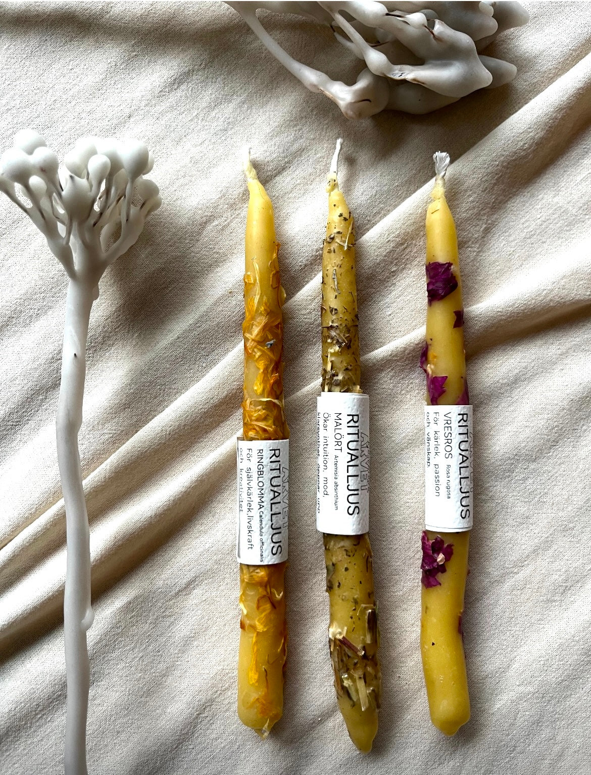 Handstöpta bivaxljus från Björnlunda Arvet infuserade med sin specifika ört och sedan rullade i den.