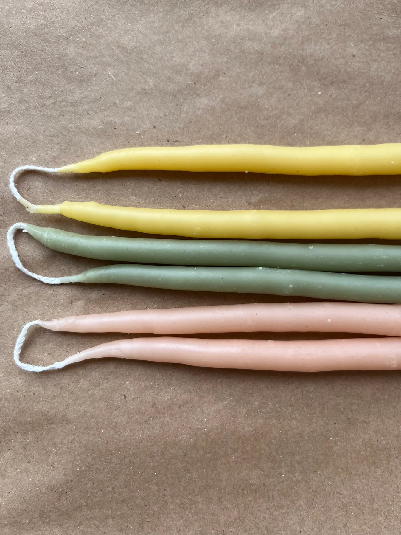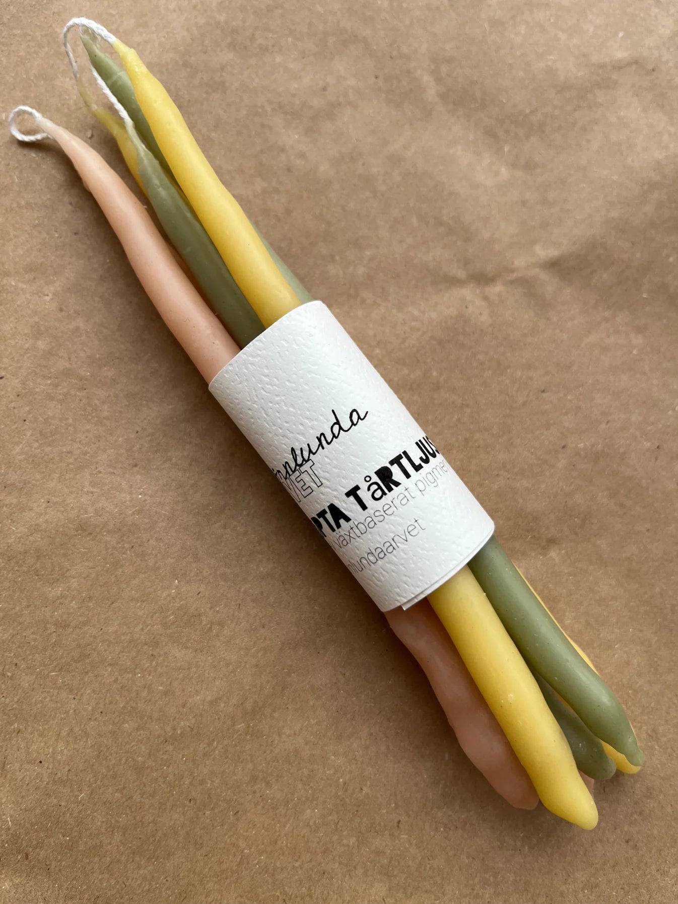 Ljusen är handstöpta av bivax och färgade med växtpigment. Veke av bomull.